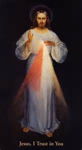From a desire to make His mercy known and accepted more, Jesus asked Faustina to have an image painted which would illustrate this. The image consisted of Jesus in a white garment, and from His heart emanated two rays – one white and one red – symbolizing the water of baptism and the blood of His sacrifice. Beneath the image He wanted the words “Jesus, I trust in You” printed.[vii] In addition to the image, Jesus wanted the Sunday following Easter to be a Feast of Mercy.[viii]